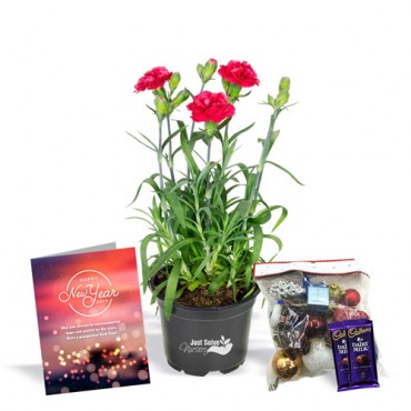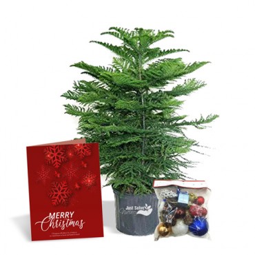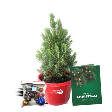 1)One Red cylindrical shaped pot with Justsolvenursery logo.2)Contains Manured Mud.3)with Bloomed Stems of Christmas Tree Plant4)Along with that One Occasional Card 5)with one pack of material of..