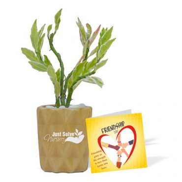 1)One glass pot with Justsolvenursery logo.2)Contains water, water balls and Pebbles.3)With Bamboo (2 layered).4)Along with that One Occasional Card.5)with one pack of chocolate Worth (Rs.150/-).Note&..