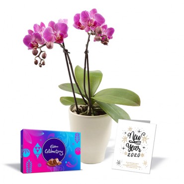 1)One White cylindrical shaped pot with Justsolvenursery logo.2)Contains Manured Mud.3)With Bloomed Stems of Orchid Plant.4)Along with that One Occasional Card 5)with one pack of chocolate Worth ..