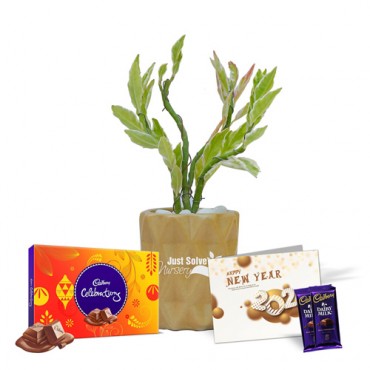 1)One White square shaped with ancient design pot with Justsolvenursery logo.2)Contains Manured mud.3)With Pansy Plant4)Along with that One Occasional Card.5)with one pack of chocolate Worth (Rs.150/-..