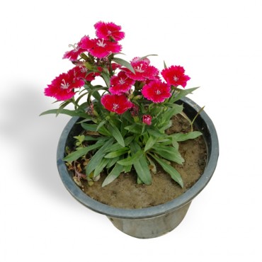 ) One Black cylindrical shaped pot with Justsolvenursery logo.2) Contains Manured Mud.3)with Bloomed Stems of Dianthus PlantNote You can reuse the pot once the plant wither away.This Arrang..