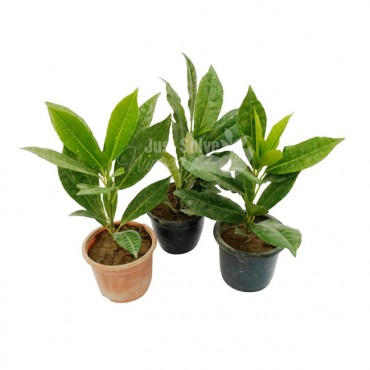 1)Three different colored cylinderical shaped pot with Justsolvenursery logo. 2) Contains Manured